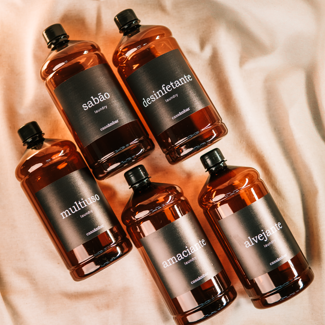 O kit acompanha: 5 frascos de 1 litro + 5 tampas + 5 etiquetas (1 de cada modelo)